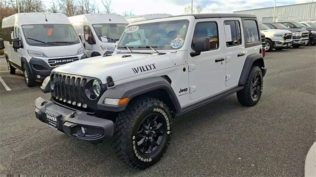 Cold Weather Group (Heated Front Seats and Heated Steering Wheel), Convenience Group (Universal Garage Door Opener), LED Headlamp & Fog Lamp Group (Front LED Fog Lamps and LED Premium Reflector Headlamps), MOPAR Grab Handle Kit (Front MOPAR Grab Handles and Rear MOPAR Grab Handles), Quick Order Package 23W Willys (4-Wheel Drive Swing Gate Decal, Anti-Spin Differential Rear Axle, Automatic Headlamps, Black Grille, Deep Tint Sunscreen Windows, Front 1-Touch Down Power Windows, Mold In Color Bumper w/Gloss Black, MOPAR All-Weather Floor Mats, Power Heated Mirrors, Premium Wrapped Steering Wheel, Remote Keyless Entry, Security Alarm, Speed Sensitive Power Locks, Sun Visors w/Illuminated Vanity Mirrors, Wheels: 17" x 7.5" Black Aluminum, Willys, and Willys Hood Decal), FCA US LLC Certified Pre-Owned Certified, 3.45 Overall Top Gear Ratio, 4-Wheel Disc Brakes, 8 Speakers, ABS brakes, Air Conditioning, AM/FM radio, Apple CarPlay, Apple CarPlay/Android Auto, Aux Battery, Black 3-Piece Hard Top, Brake assist, Cloth Low-Back Bucket Seats, Compass, Delay-off headlights, Driver door bin, Driver vanity mirror, Dual front impact airbags, Dual front side impact airbags, Electronic Stability Control, Emergency communication system: SiriusXM Guardian, Engine Oil Cooler, Freedom Panel Storage Bag, Front anti-roll bar, Front Bucket Seats, Front Center Armrest w/Storage, Front fog lights, Front reading lights, Google Android Auto, GPS Antenna Input, Integrated Center Stack Radio, Integrated roll-over protection, Integrated Voice Command w/Bluetooth, Low tire pressure warning, MOPAR HD Rock Slider w/Step Assist (DISC), No Soft Top, Non-Lock Fuel Cap w/o Discriminator, Normal Duty Suspension, Occupant sensing airbag, Outside temperature display, ParkView Rear Back-Up Camera, Passenger door bin, Passenger vanity mirror, Power steering, Radio data system, Radio: Uconnect 4 w/7" Display, Rear anti-roll bar, Rear reading lights, Rear Window Defroster, Rear Window Wiper/Washer, Speed control, Split folding rear seat, Steering wheel mounted audio controls, Stop-Start Dual Battery System, Tachometer, Telescoping steering wheel, Tilt steering wheel, Traction control, Trip computer, USB Host Flip, Variably intermittent wipers, Wheels: 17" x 7.5" Black Steel Styled, and Wheels: 17" x 7.5" Moab Black Aluminum (DISC)