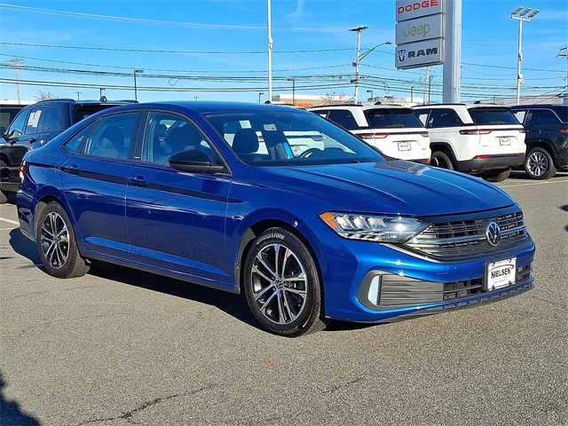 Blue 2023 Volkswagen Jetta 1.5T Sport FWD 8-Speed Automatic with Tiptronic 1.5L I-4 DI DOHC Turbocharged Storm Gray Cloth.